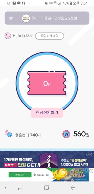 저의 경우에는 포인트를 현금전환하는데 모두 꼬라박아서 현재 보유포인트는 0, 현금은 560원이 있습니다.