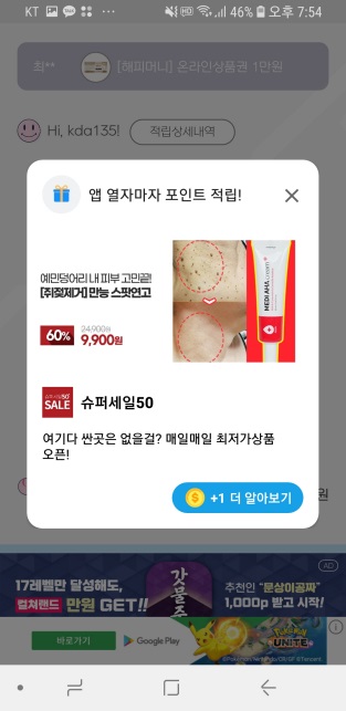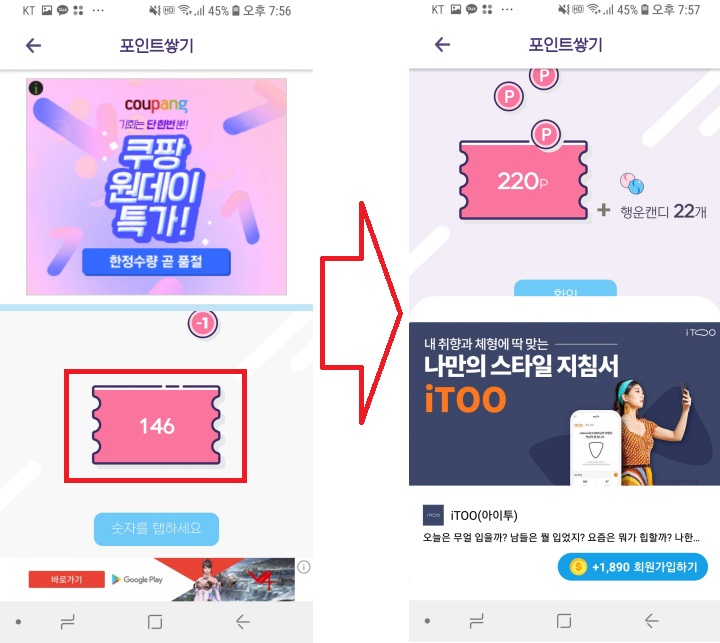 가끔 앱을 실행하거나 포인트쌓기(터치)를 완료하면 위 사진처럼 팝업광고가 나타날 때가 있습니다.
