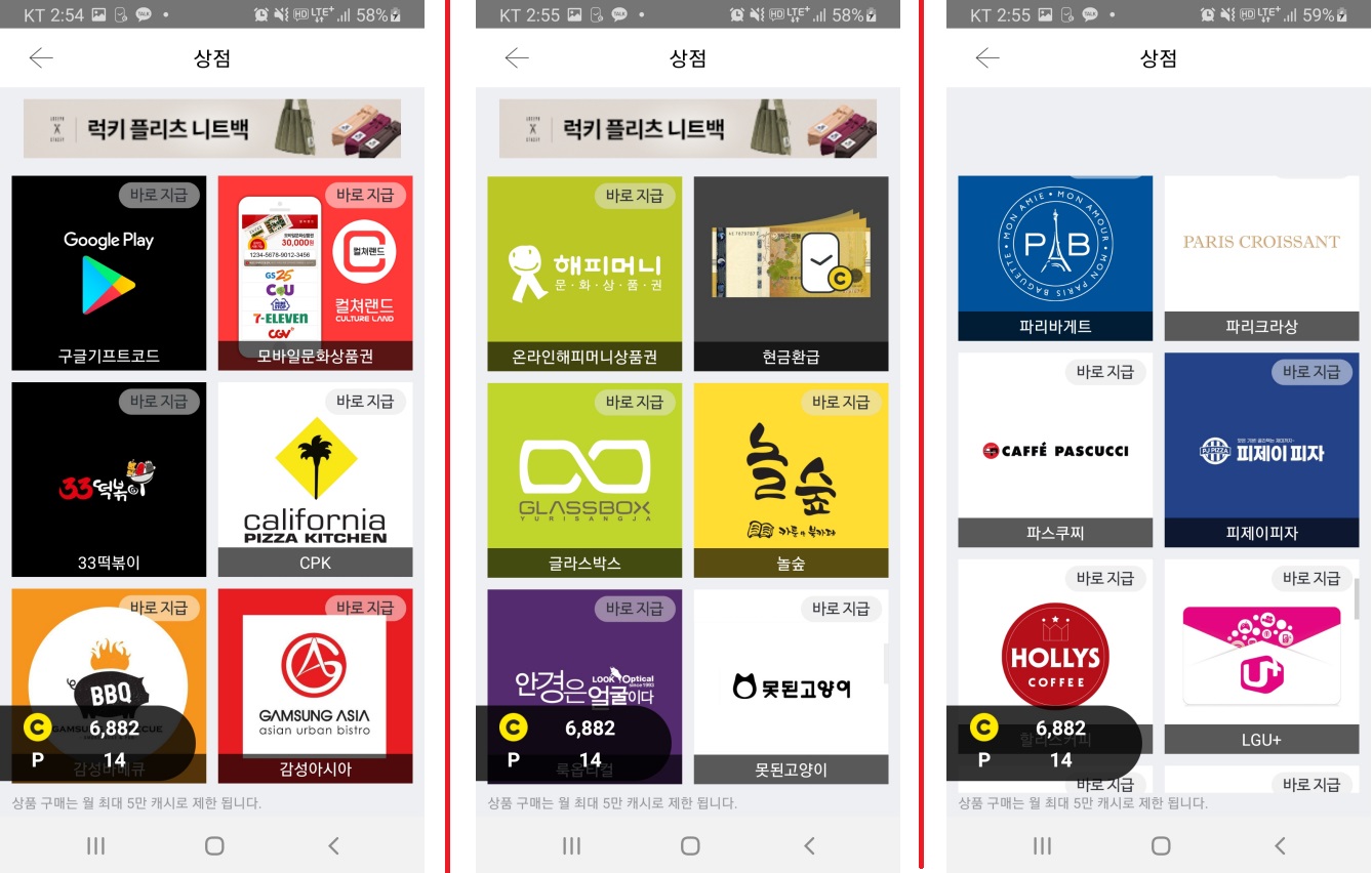 예를 들어 구글 기프트카드를 상점에서 구매하려면 1만 포인트 이상을 모아야 하는데 70캐시를 이용하여 몇 번 도전해서 당첨되면 어쨌든 이득인거죠.