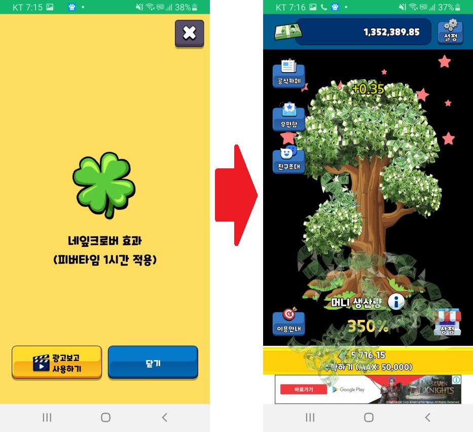 간단히 말해 네잎클로버 광고시청 하면 1시간 동안 '피버타임' 효과가 적용됩니다.