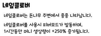 즉, 네잎클로버를 이용하면 1시간 동안 머니 생산량이 250% 증가합니다.