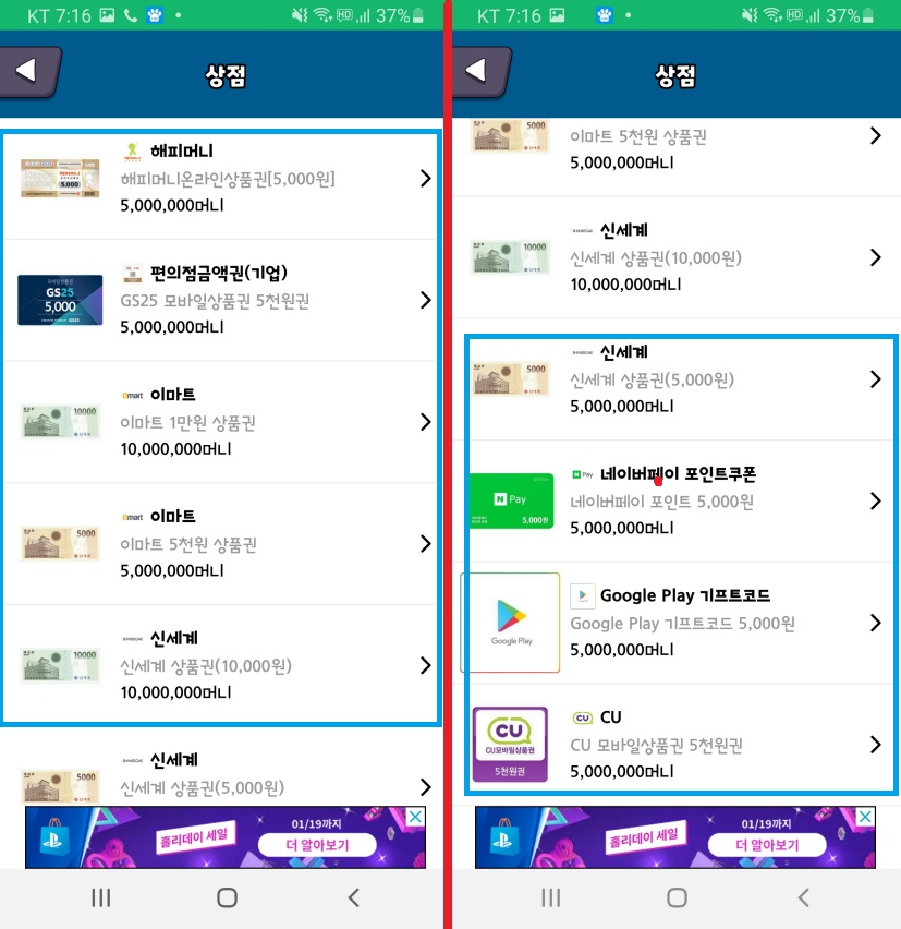 해피머니 상품권, GS25/CU 상품권, 이마트/신세계 상품권, 구글 기프트카드, 네이버페이 쿠폰이 있습니다.