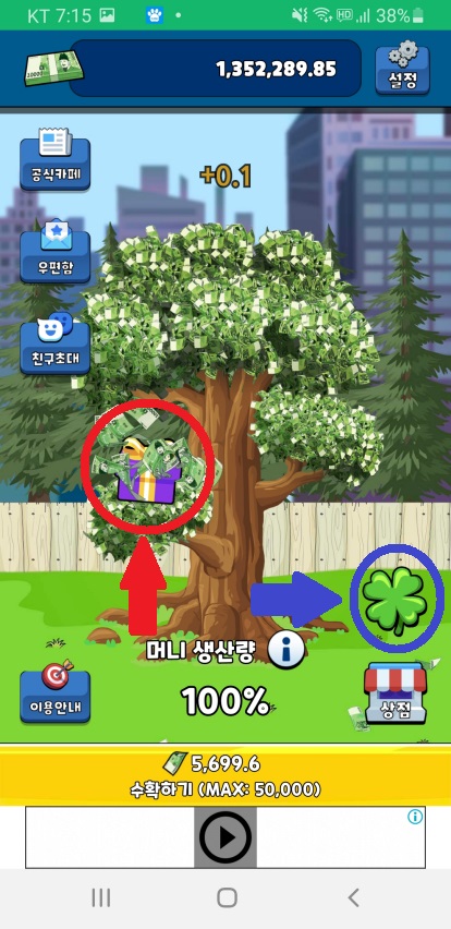 돈농사 메인화면에서 나무에 걸려있는 보라색 상자와 네잎 클로버를 보실 수 있을 것입니다.