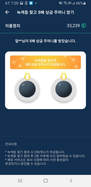 1/2 확률로 녹색 등을 찾아보세요. 녹색 등을 찾으면 5배 상금 주머니가 지급됩니다.