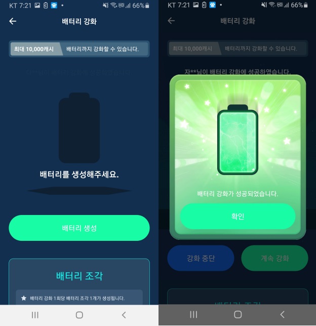배터리를 생성/강화/중단해서 캐시를 받는 기능입니다.