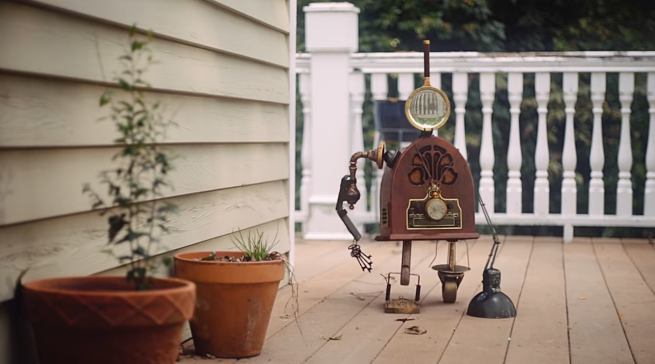 스스로 움직여 만들어진 깡통로봇은 쌓인 상자 위로 올라가 초인종을 눌렀지만 이내 상자가 쓰러져버리고, 난간 옆으로 굴러떨어지고 맙니다.
