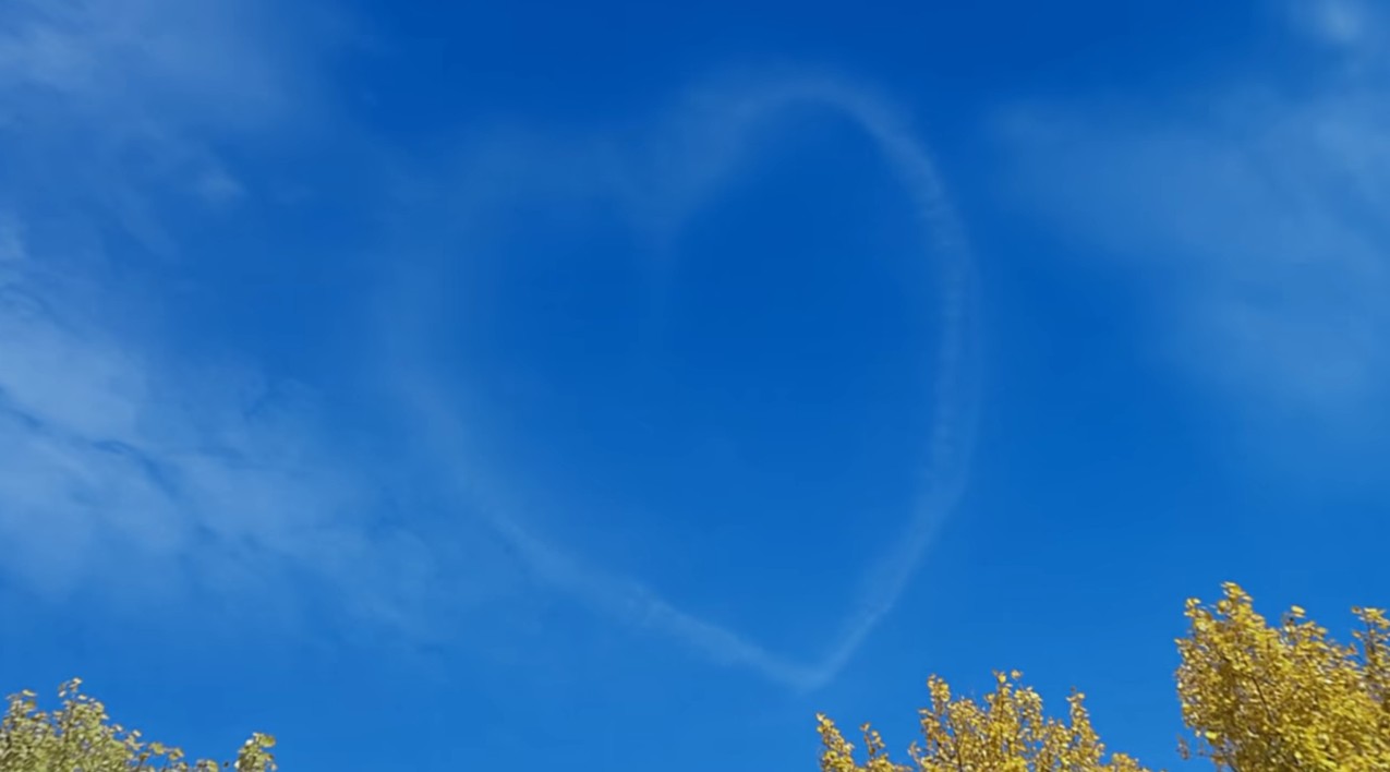 여자가 하늘을 올려다보는데, 하늘에는 하트 모양의 구름이 그려져 있습니다.