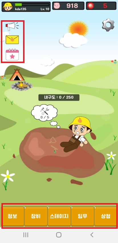 화면 좌측 상단에 있는 버튼들은 공지사항을 확인하거나 오늘 몇 회 땅파기를 했는지 확인할 수 있습니다.
