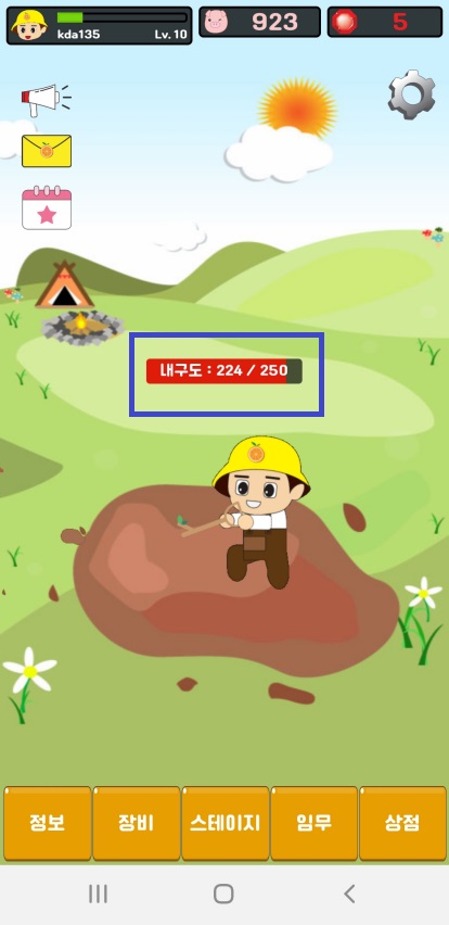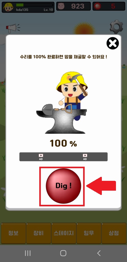 또 수리도 100% 채워서 광고 시청하고 내구도 다 닳을 때까지 땅파는거 기다려주고... 반복입니다~~