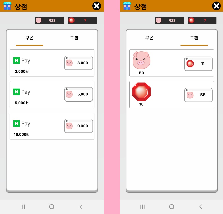 [교환]에서는 피그코인을 루비로 교환하거나, 루비를 피그코인으로 교환할 수 있습니다.