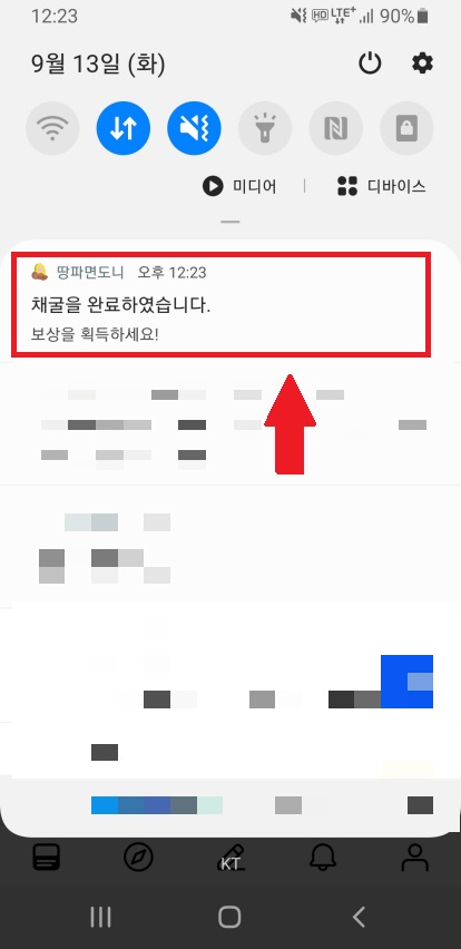 시간이 지나서 땅을 다 파면 위 사진과 같이 푸시 알람이 옵니다.