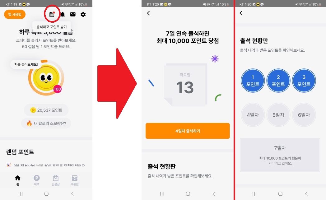 해당 숫자는 걸음을 통해 쌓은 포인트로, 누르면 1포인트씩 적립됩니다.
