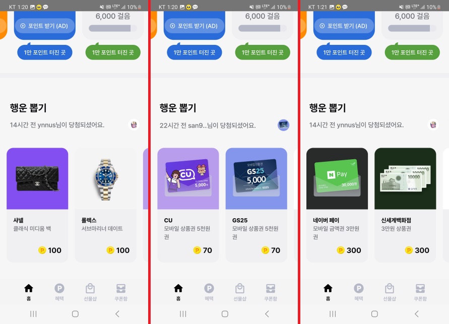 저는 딱 한 번 당첨된 적 있고, 100포인트도 여러 번 당첨된 적이 있답니다.