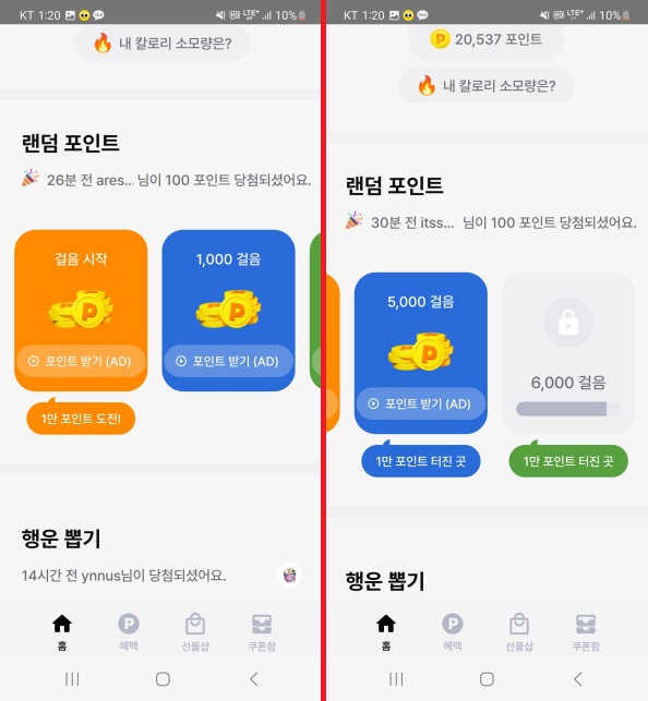 만보를 걸었다면 10,000 걸음까지 랜덤 포인트 도전할 수 있겠죠?