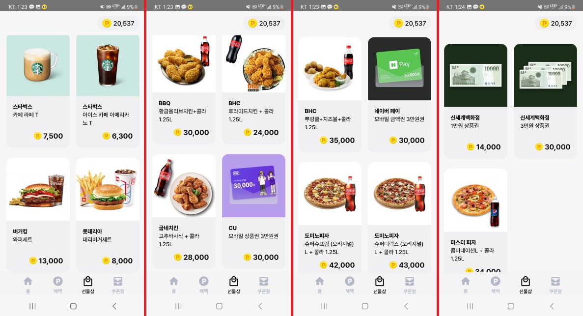 햄버거, 피자, 치킨 등 푸드 기프티콘에 대해서는 포인트 가치가 조금 떨어집니다. 대략 (1.5:1 가량)