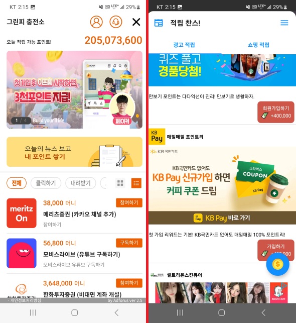 위 사진에서 보시다시피 하단의 가리킨 부분에 추가로 머니를 적립할 수 있는 방법들이 모여있답니다.