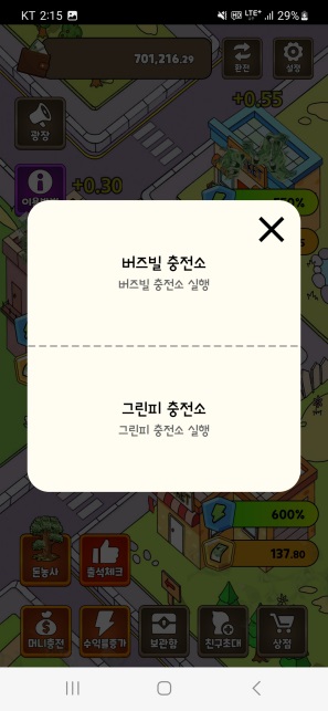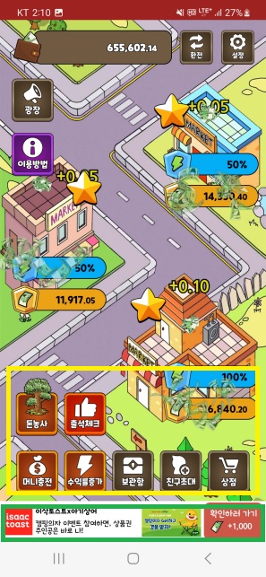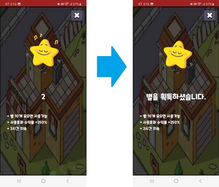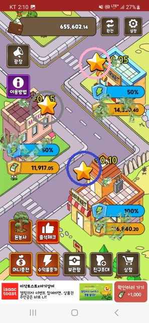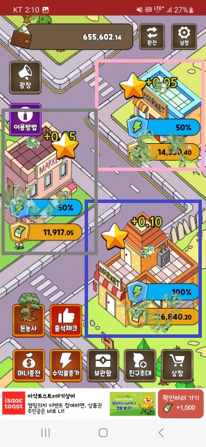 (4) 부스터2 : 편의점 건물 주변에 생성되는 별 10개를 이용하여 머니 방치 생산량을 증가시킵니다.