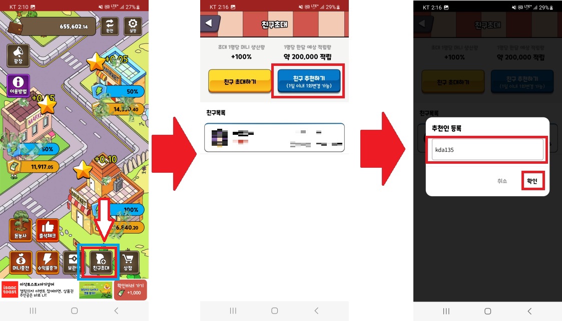 [4] 추천인 등록에 'kda135' 입력