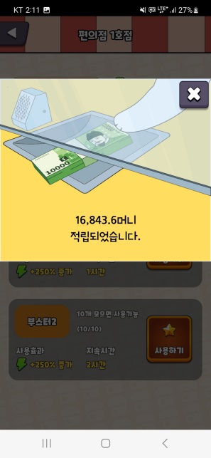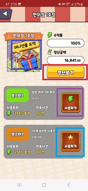 부스터2는 2시간 동안 방치로 생성되는 머니량이 250% 증가하며, 부스터1과 다르게 하루에 사용 횟수 제한이 없습니다.