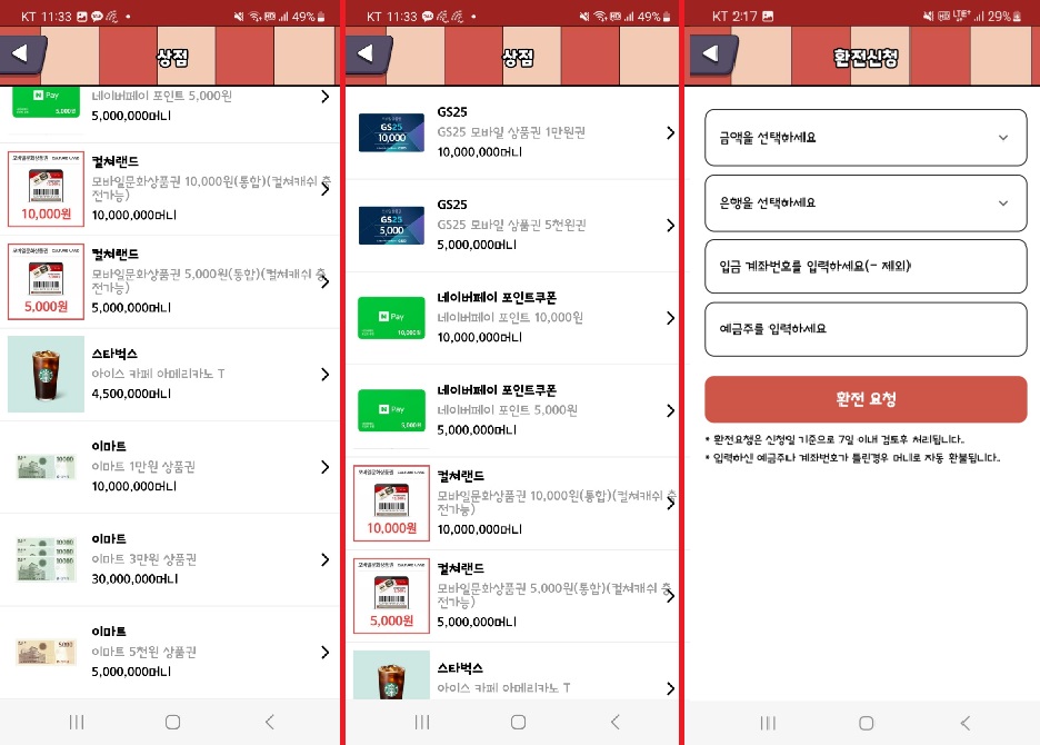 '상점'에서는 머니를 사용하여 컬처랜드 문화상품권, 스타벅스 아메리카노 기프티콘, 네이버페이, GS25 금액권으로 교환할 수 있고요.