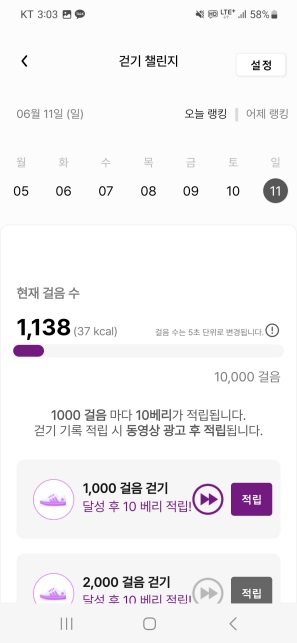 만보로 하루 최대 100베리까지 적립할 수 있습니다.