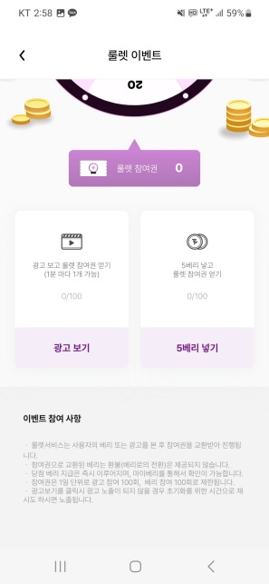 룰렛 참여권은 광고를 시청하고 얻거나, 아니면 5베리를 이용하여 얻을 수 있습니다.