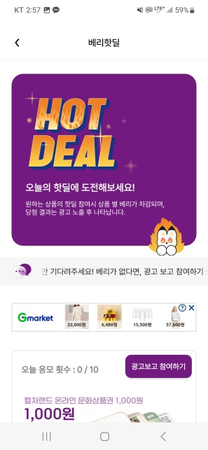 베리핫딜은 광고 시청 또는 베리를 이용하여 참여 가능하다는데,
