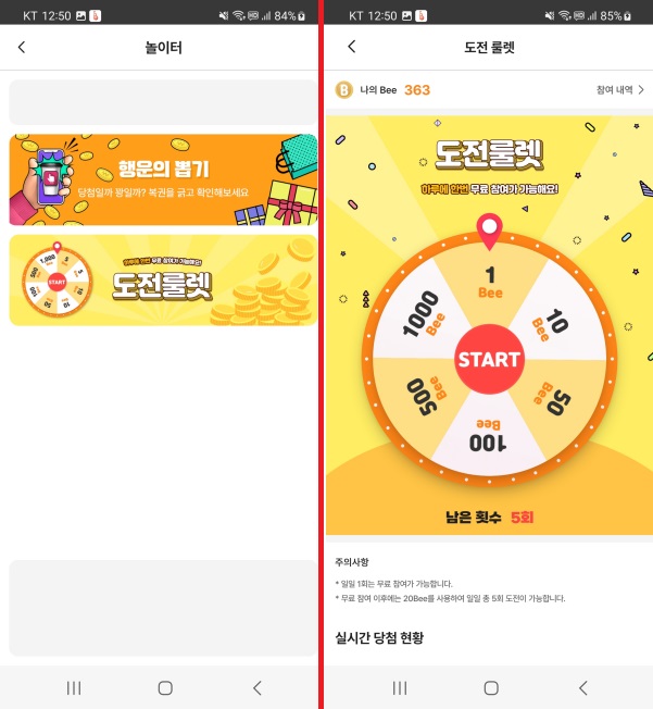 도전 룰렛에서는 최소 1 Bee에서 최대 1000 Bee 까지 획득할 수 있습니다.