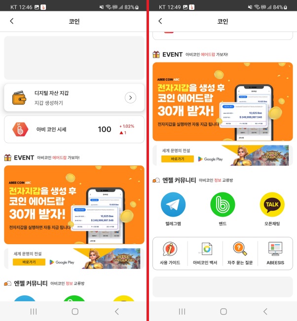 현재 에어드랍 이벤트 진행 중으로 아비 전자지갑 생성 시 에어드랍 30개를 받을 수 있다네요.