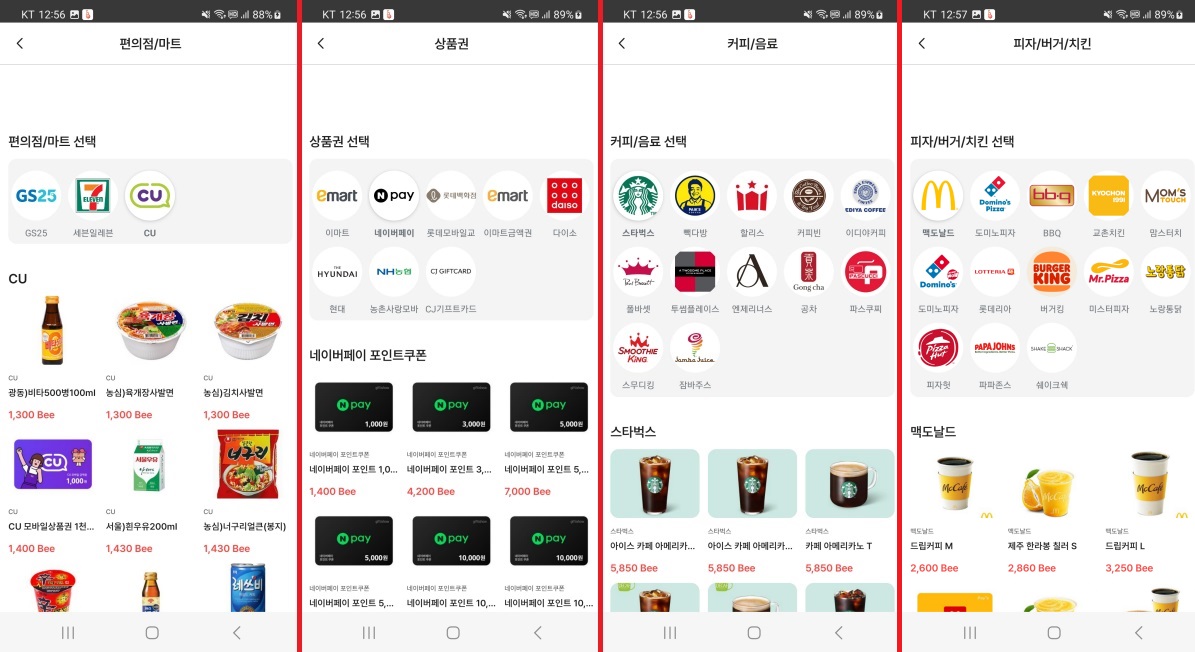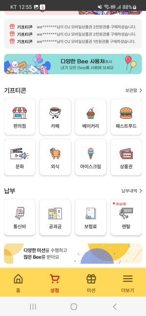 교환할 수 있는 기프티콘으로는 편의점, 카페, 베이커리, 패스트푸드 등이 있네요~