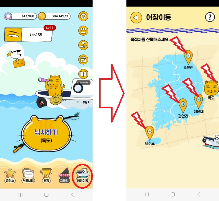 우측하단의 '어장이동' 버튼을 누르면 5곳의 낚시터를 확인할 수 있습니다.