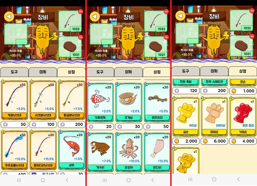 낚싯대와 미끼들은 진주를 이용하여 구매할 수 있고, 손 아이템은 코인으로만 구매할 수 있습니다.