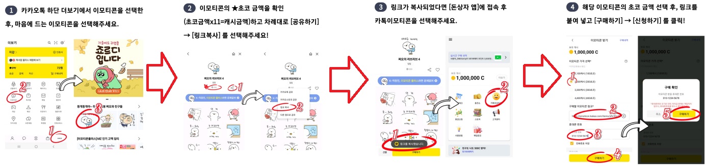 카카오톡 이모티콘 구매 방법은 앱 내 '물음표' 아이콘을 누르면 자세히 설명되어 있습니다.