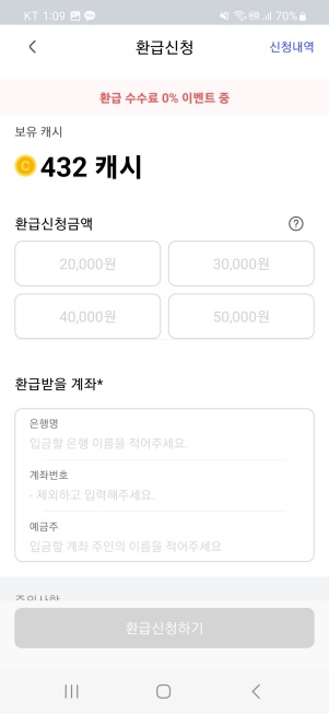 첫 번째는 '환급신청'으로 여러분이 모은 캐시를 실제 현금으로 받을 수 있습니다. (통장 입금 형태)