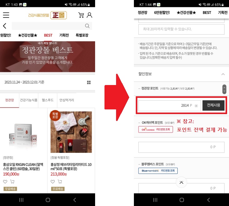 케어나우에서 받은 포인트는 정몰(정관장몰)에서 1:1 비율로 사용할 수 있습니다. (전액결제 가능)