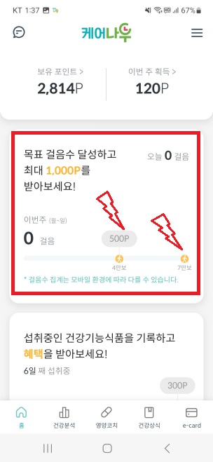 일주일 동안 4만 보를 달성하면 500포인트를 받으며, 7만 보를 달성하면 추가로 500포인트를 받을 수 있습니다.