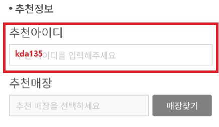 ※ 추천인 입력은 가입 전 '추천정보 → 추천아이디'에 입력할 수 있습니다.