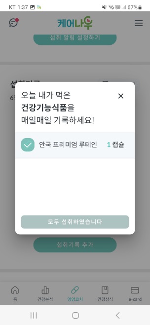 건강기능식품 설정은 케어나우 메인화면 하단의 '영양코치'를 통해 할 수 있습니다.
