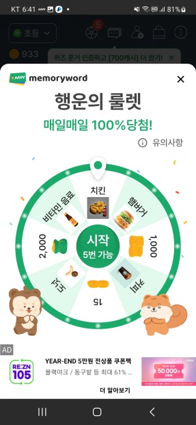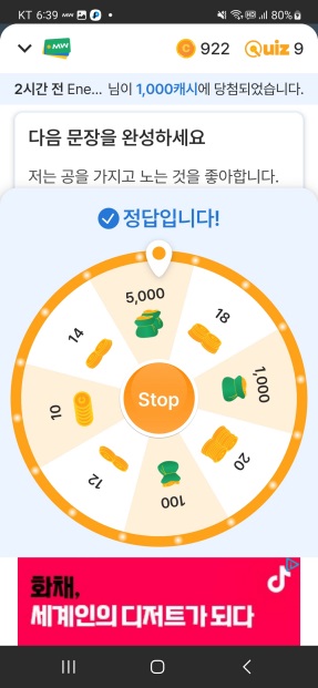영어퀴즈를 맞추면 캐시를 받을 수 있는 룰렛이 돌아갑니다.