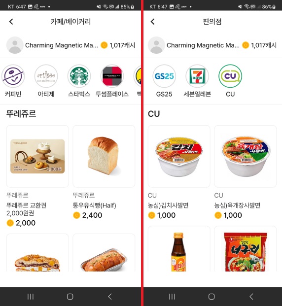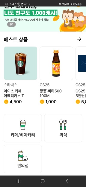 이렇게 모으신 캐시는 어플 내 '상점'에서 다양한 기프티콘으로 교환할 수 있습니다.