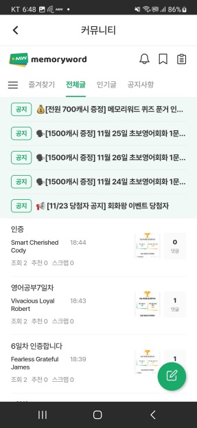 메모리워드 앱에는 '커뮤니티'가 있습니다.