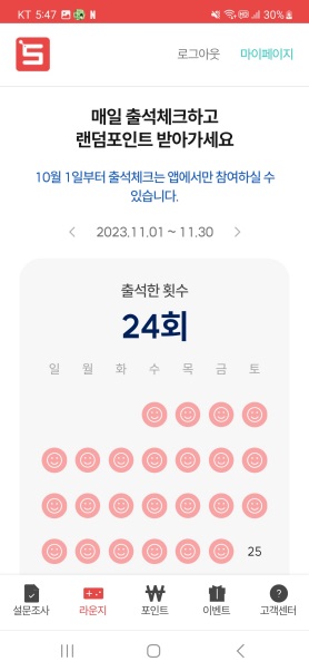 출석체크 - 3점 / 조사 대상이 아니거나 인원초과로 탈락 - 10점 / 설문 참여 완료 - 30점