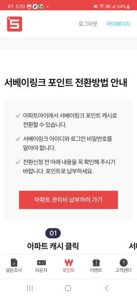 아파트아이에서 서베이링크 계정과 연동한 후 포인트를 아파트아이 캐시로 전환하면 됩니다.