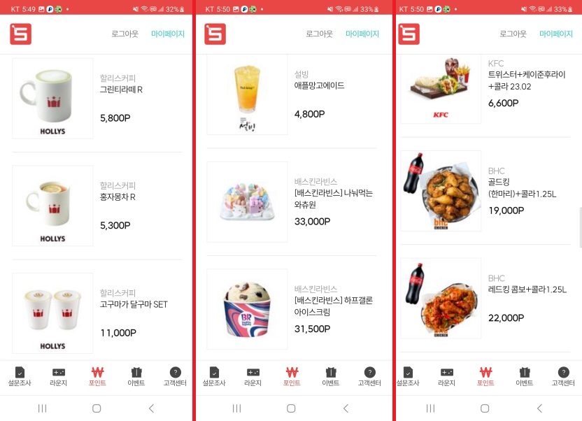 획득한 보상으로는 다양한 기프티콘/상품권으로 교환, 현금으로 교환 등이 가능하여,