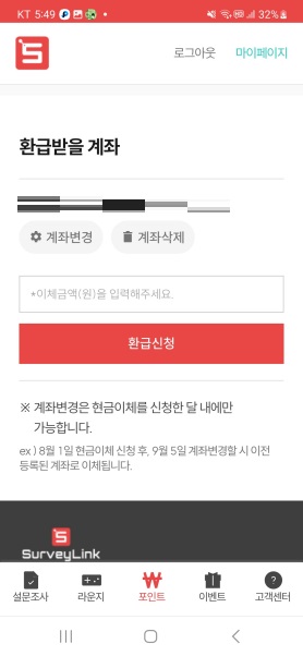 열심히 모은 포인트를 계좌를 통해 현금으로 받아볼 수 있습니다.