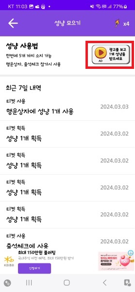 눌러보면 '광고를 보고 1개 성냥을 받으세요'라는 버튼이 보입니다.