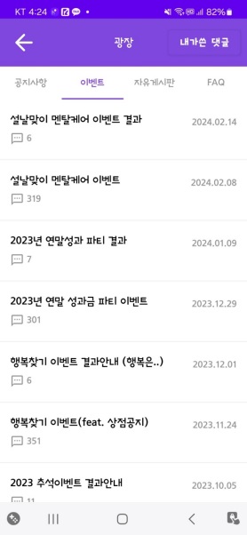이벤트는 '광장'의 '이벤트' 탭에서 확인할 수 있습니다.