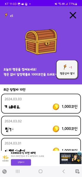 꽝이면 1코인을, 당첨되면 무려 1천 코인을 획득할 수 있습니다.