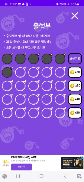 25일동안 출석만 열심히 해도 150코인을 받아갈 수 있군요.