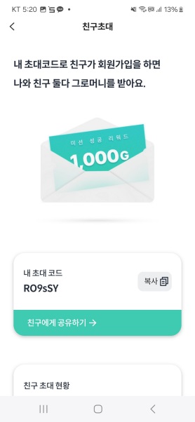그로켓에 친구초대를 완료하면 서로 1000G를 받을 수 있습니다.